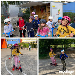 Schulhof das Rollerfahren zu trainieren. Nach vorsichtigen Anfängen und kleinen Unsicherheiten wurden viele Kinder zu mutigen und wendigen Rollerfahrerinnen und Rollerfahrern. Vielleicht