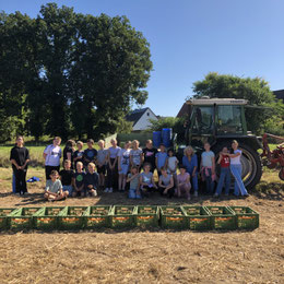 (J.O.)Wir fuhren mit dem Bus in die WABE, wo uns Frau Regina Cordes begrüßte. Drinnen angekommen suchte sich jeder einen Platz und die Erwachsenen stellten sich vor. Anschließend gingen wir in einen anderen Raum und wuschen uns die Hände. In dem Raum standen vier Tische mit jeweils einem Kartoffelrezept. Ich entschied mich für das knusprige Kartoffelfladenbrot, das ich dann mit meinen Freunden backte. Während die Sachen im Ofen waren, frühstückte die ganze Klasse. Danach gingen wir zu dem Kartoffelacker, auf dem wir am 28. April Kartoffeln gepflanzt hatten. Als wir dort ankamen, war auch der Traktor schon da, der dann unsere Kartoffelreihe rodete. Danach sammelten wir die Kartoffeln ein. Ich habe unter anderem auch eine sehr kleine Kartoffel gefunden. Als wir wieder in der WABE waren, verteilten wir die Kartoffeln auf Säcke. In jeden Sack kamen 5 kg Kartoffeln. Am Ende haben wir dann die selbstgemachten Kartoffelgerichte gegessen. Alles hat sehr lecker geschmeckt! Zur Verabschiedung hat jedes Kind ein Kochbuch und einen Sack mit den von geernteten Kartoffeln bekommen. Das war toll! Mattis Vogelsang (Klasse 4b )