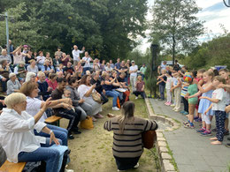 (L.K.)Am 22.09.2024 feierte die Stadt Osnabrück den Weltkindertag. Viele Kinder aus allen Osnabrücker Schulen waren dort, um neben den vielen Mitmachstationen wie Schminken, Zielschießen mit Fußball, Rätsel lösen, .. auch am großen Chor auf der Rathausbühne mitzusingen. Linda Efferts hatte extra das Lied "Kleine Kinder riesengroß" für diesen Tag komponiert. Es war überwältigend. Viele Osnabrücker Schulen hatten Kinder entsandt und alle standen gemeinsam auf dergroßen Bühne. So auch viele Kinder aus der Schule in der Dodesheide. Die Bühne war gerammelt voll und alle gaben ihr bestes. Begleitet von Linda Efferts Gitarre und einem Kinder-Streicher-Ensemble, die sich "Das Sägewerk" nannten sangen alle aus vollen Kehlen. Einigen war das Lampenfieber leicht anzumerken. Es gehört schon viel Mut dazu, vor hunderten Zuschauern zu singen. Aber belohnt wurde dieser Mut mit einem tosenden Applaus. Was für ein Auftritt! Was für ein herrlicher Tag.