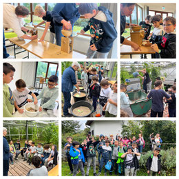 (Kl. 4a) Wir fuhren mit dem Bus am Mittwoch, den 21.08.2024, ins WABE-Zentrum. Schon die Fahrt war sehr lustig und wir hatten viel Spaß. Vor Ort war es dann unsere Aufgabe, die Kartoffeln zu ernten, die wir im Frühjahr in die Erde gesetzt hatten. Anfangs kochten und buken wir jedoch mit Kartoffeln. Anschließend ging es nach einem kurzen Frühstück zur Arbeit auf den Acker. Der war leider wegen des Regens sehr matschig. Zum Glück bekamen wir vom WABE- Zentrum Überzieher für unsere Schuhe. Und schon ging‘s los. Der Bauer Lukas fuhr mit seinem Trecker voran. Das war auch für den Trecker auf dem matschigen Boden ganz schön schwierig. Auf das Hubsignal ging es dann für uns los. Wir sammelten die Kartoffeln aus der Erde, sortierten und säuberten sie. Zurück in der WABE wuschen wir unsere Hände und wurden von dem Duft unserer vorbereiteten Gerichte angelockt. Alles war lecker, aber besonders überrascht waren wir von dem Kartoffelkuchen und den Kartoffel-Mandelkeksen, da man kaum schmeckte, dass Kartoffeln darin waren. Zum Abschluss bekamen wir noch ein Rezeptbuch geschenkt. „Das schmeckt“ ist ein passender Titel finden wir. Da wir 72 Kilo geerntet hatten, bekam jedes von uns 24 Kindern 3 Kilo Kartoffeln mit nach Hause. Was für ein schöner Abschied vom WABE-Zentrum! Vielen Dank!