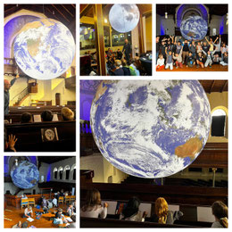 (V.B.) Am Freitag, den 29.8.25, besuchten wir, die Klasse 3b, die GAIA-Ausstellung in der Bergkirche Osnabrück. Wir konnten eine riesige, beleuchtete Weltkugel mit 6 m Durchmesser bewundern und fühlten uns ein wenig wie AstronautInnen im Weltraum! Wir entdeckten verschiedenste Kontinente und uns wurde klar, warum unsere Erde „der blaue Planet“ genannt wird! Unsere Eindrücke hielten wir in Bildern fest, die in einer Miniausstellung in der Schule (Trakt 3) angeschaut werden können.