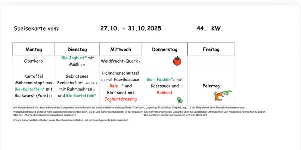 Bio-Qualität haben. Es muss pro Woche einmal Fleisch, einmal Fisch und dreimal vegetarisches Essen geben. Sogar, wie viel Gramm der Nachtisch haben soll, ist genau festgelegt. Auch wir als Schule